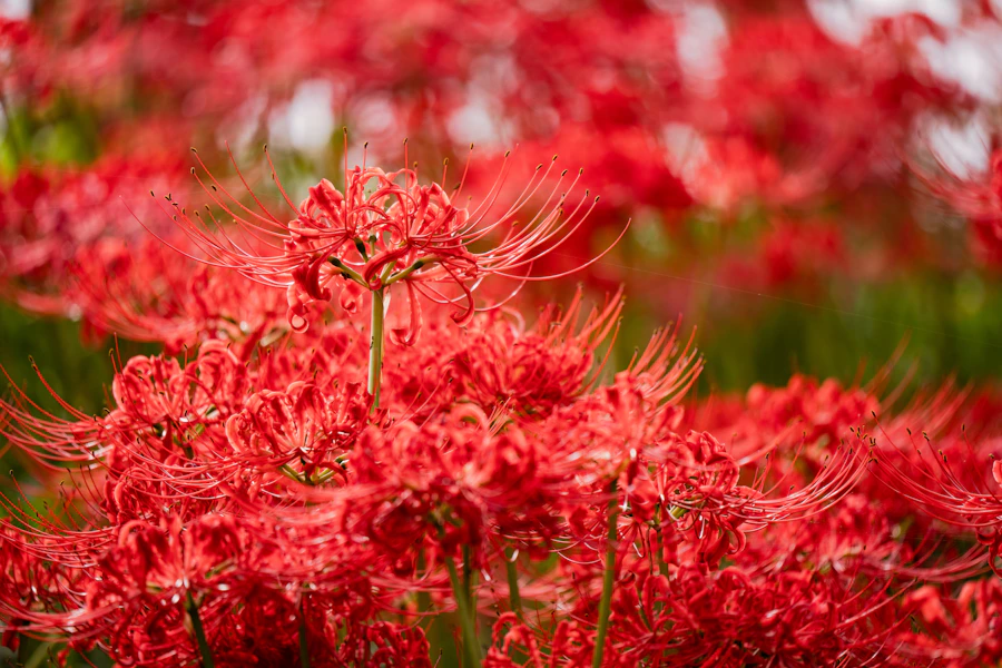 피안화(히간바나·彼岸花)는 한국에서 "꽃무릇"으로도 불리며, 일본어 이름 "히간바나"는 "피안(저세상)의 꽃"이라는 뜻입니다. 꽃이 질 무렵 잎이 나고, 잎이 질 무렵 꽃이 피는 특성 때문에 "잎과 꽃이 결코 만나지 못하는 꽃(葉見ず花見ず)"이라고도 불립니다. 이 꽃이 피는 시기가 추분(히간)과 일치한다는 것, 그리고 묘지 주변에 많이 심는 관습(독성이 있어 두더지 등 해충을 쫓기 위한 목적) 때문에 "저승과 이승의 경계"를 상징하는 꽃으로 여겨지게 되었습니다. 사이타마현 히다카시 킨차쿠다(巾着田)의 피안화 군락은 자연 발생한 것으로, 히가나 강이 자루 모양(巾着)으로 굽이치는 지형 안쪽에 약 500만 송이가 군집하여 자랍니다.